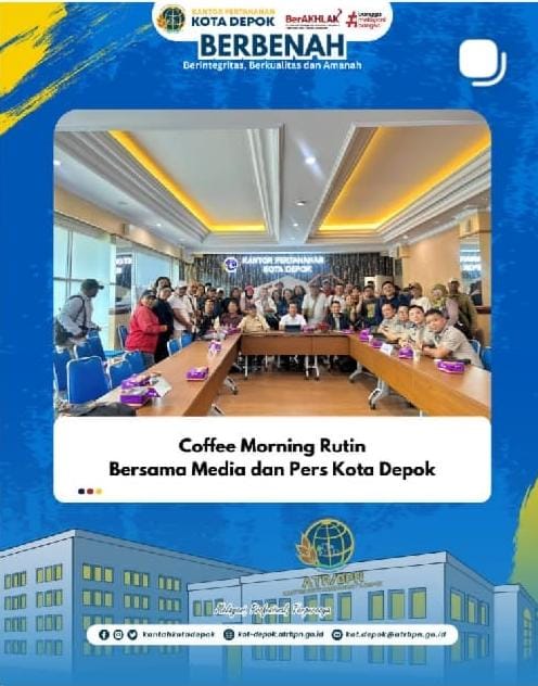 berintegritas,berkualitas dan amanah,bersama media dan pers kota depok.Kepala Kantor Pertanahan Kota Depok saat ini adalah Budi Jaya, S.T., M.T., QRMP. Tugas & fokus Melanjutkan pelayanan publik terkait sertifikasi, pemetaan, program PTSL, serta mendorong transformasi digital dan pelayanan prima.Genap Satu tahun menjabat Kepala Kantor Pertanahan Kota Depok.